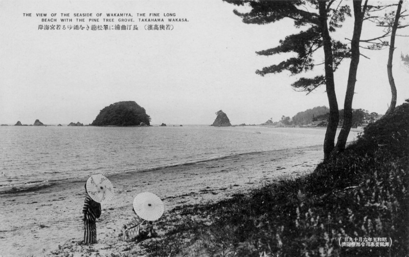 ★若狭・高浜・丁汀曲浦に翠松趣きを添ゆる若宮海岸(昭和5年頃) No. と同一場所です。 軍・司令部の閲覧済の印字、海岸線のチェックは厳しかったようです。 〜絵葉書でタイムスリップ〜