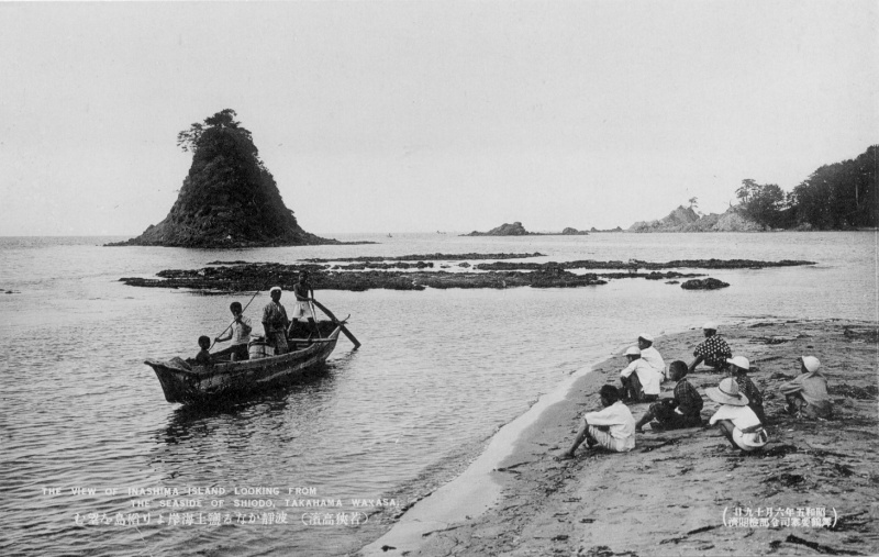 ★若狭・高浜・波静かなるしお土海岸より稲島(いなしま)を望む(昭和5年頃) 軍・司令部の閲覧済の印字、海岸線のチェックは厳しかったようです。 〜絵葉書でタイムスリップ〜