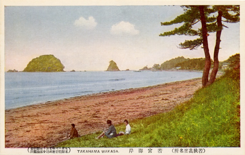 ★若狭・高浜名所・若宮海岸(大正13年頃) No. の写真と同一場所。 軍・司令部の閲覧済の印字、海岸線のチェックは厳しかったようです。 〜絵葉書でタイムスリップ〜