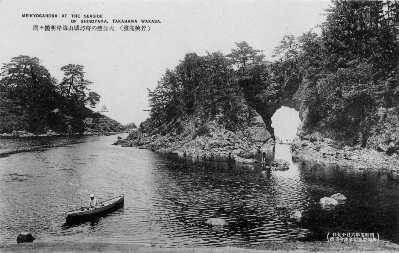 ★若狭・高浜・大自然の奇巧 城山海岸、明鏡ヶ洞(昭和5年頃) No. の写真と同一場所。 軍・司令部の閲覧済の印字、海岸線のチェックは厳しかったようです。 〜絵葉書でタイムスリップ〜