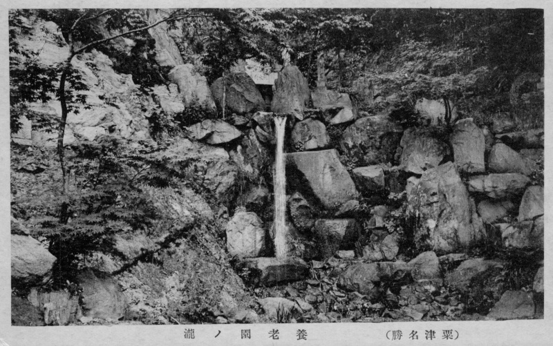 ★加賀の霊泉・粟津の勝景・(粟津名勝)・養老園ノ瀧・・・(年代不明) 粟津温泉の裏景にある岳山、養老山の養老公園にあると思われます。 但し、詳細情報は未確認です。「男滝」や「おちょぼ滝」という滝が山内に ありますので、この画像から見て、後者の方でしょうか?未確認ですが。 〜絵葉書でタイムスリップ〜