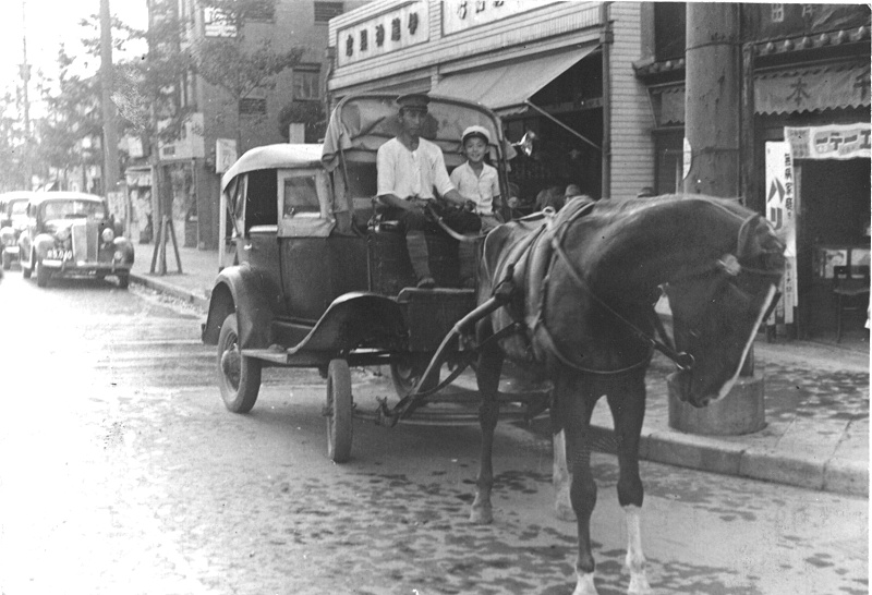 ★千本今出川・西入ル北側付近・馬車の後方はタクシー(えんたく)・(昭和初期頃)